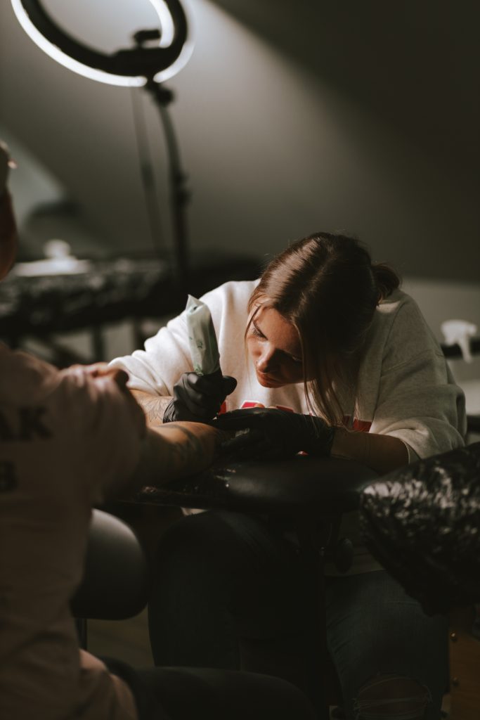 Ich bin Alina und ich habe 2022 während meines Studiums der Sozialwissenschaften das Tätowieren für mich entdeckt und lieben gelernt. Meine besten Freund*innen haben mich ermutigt, damit anzufangen und ich bin ihnen noch immer sehr dankbar dafür. Obwohl immer klar war, dass ich in einem kulturellen und politischen Umfeld arbeiten möchte, konnte ich mich von der neu gewonnenen Leidenschaft nicht mehr trennen. Daher arbeite ich seit 2023 als selbstständige Tätowiererin. Für Politik interessiere ich mich aber weiterhin und versuche mich in meiner Freizeit so gut es geht zu engagieren.
