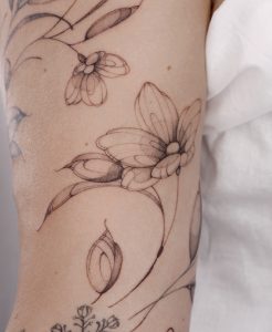 Ich liebe florale Tattoos und steche außerdem gerne Freehand-Tattoos. Das bedeutet, dass ich euch eine Skizze des Motivs mit einem sterilen Hautmarker an die gewünschte Stelle zeichne und dann in meinem Stil beim Tätowieren die Details einarbeite. Das Besondere daran: wir können das Tattoo perfekt an euren Körper anpassen und ein ganz individuelles Tattoo stechen, das nur ihr auf eurer Haut tragt!